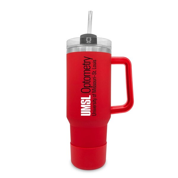 Stay hydrated in bold Tritons style with this Red UMSL Optometry 40oz Tumbler. Crafted with a soft-touch matte finish, this generously sized tumbler features a sturdy handle for comfortable carrying, a clear secure lid, and a reusable straw for convenience. The vertical UMSL Optometry graphic in white and black pops against the bright red body, making it a perfect gift for optometry students, faculty, and alumni who want to show their pride on the go.