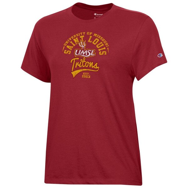 Rep your Triton pride in bold color with the University of Missouri–St. Louis (UMSL) Women’s Cardinal Red Tee. This classic short-sleeve features a distressed full chest graphic highlighting UMSL Tritons lettering and establishment year in gold and white.