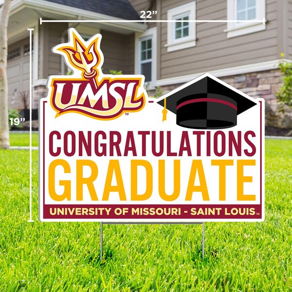 Celebrate your UMSL graduate with this eye-catching 19” x 22” yard sign featuring bold “Congratulations Graduate” text, the University of Missouri–St. Louis logo, and a graduation cap graphic. This sign is printed on durable, weather-resistant plastic and includes metal stakes for easy outdoor display. It's the perfect way to recognize your grad’s hard work and share your Triton pride with the neighborhood!