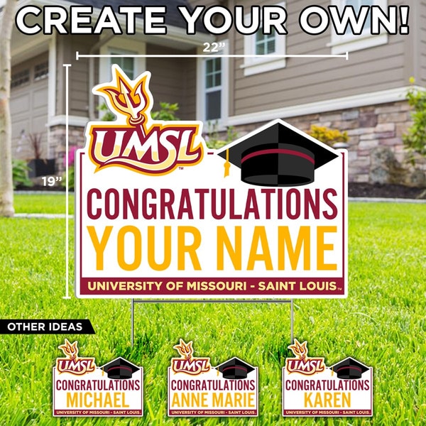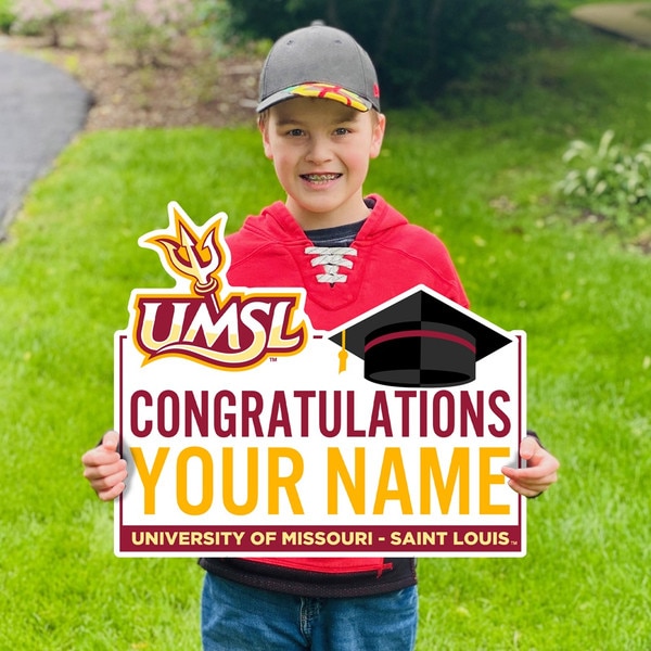 Show your pride in a UMSL graduate with this personalized lawn sign! Measuring 19 inches by 22 inches, this custom graduation yard sign lets you add your grad’s name to a bold “Congratulations” design featuring the UMSL Tritons logo and a graduation cap. Made from durable, weather-resistant material, it’s ideal for displaying at home, parties, or campus celebrations. Includes metal stakes for easy lawn setup. Celebrate your graduate’s milestone with a personalized touch!